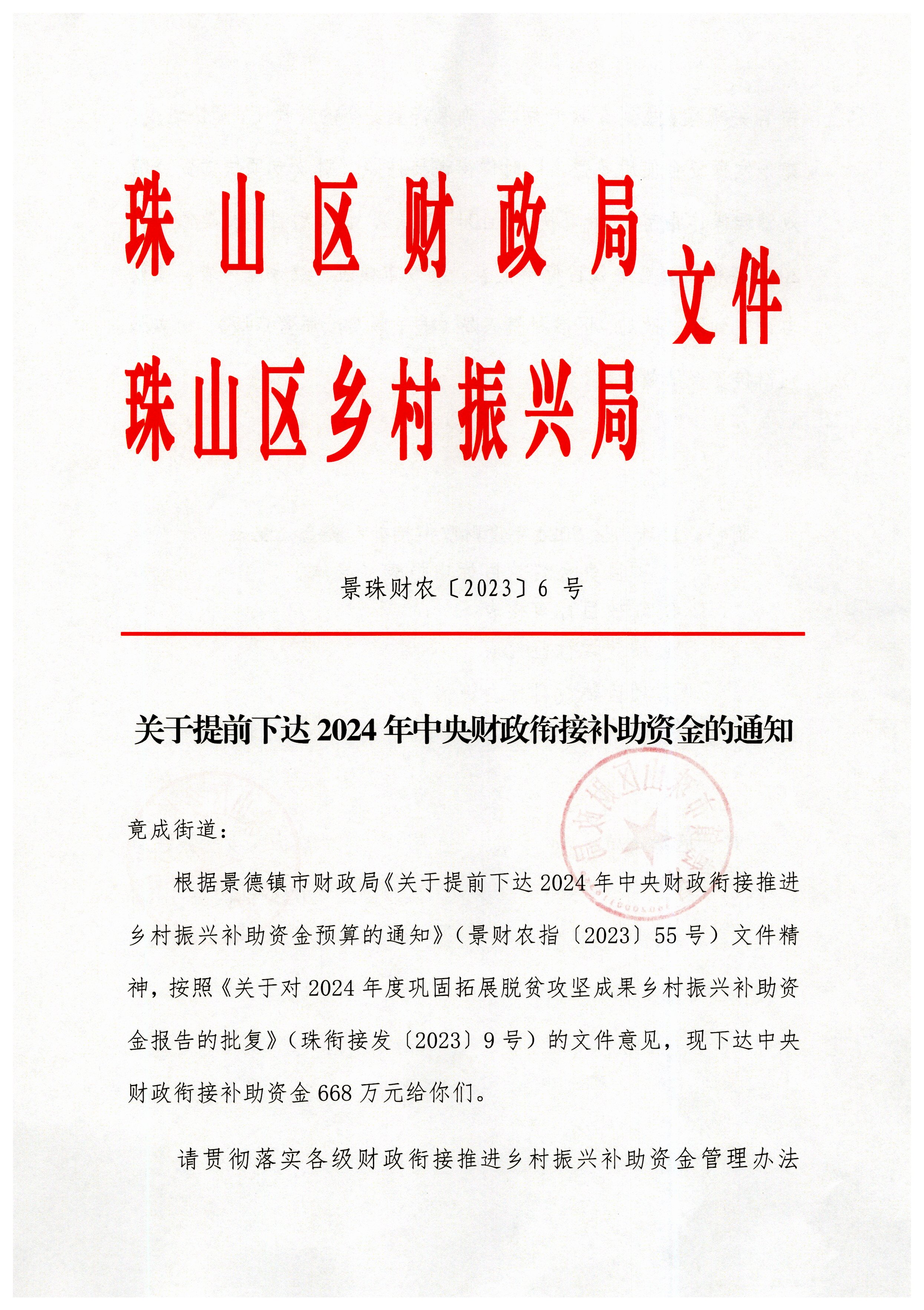 提前下达2024年中央财政衔接补助资金668万元