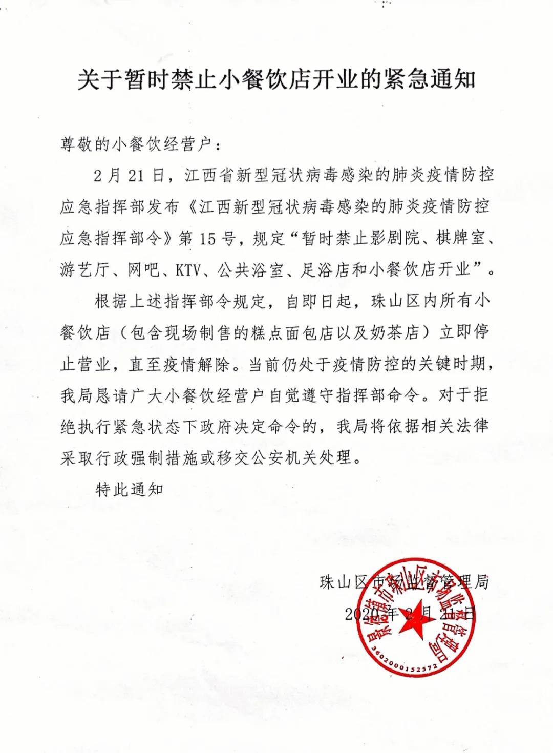 2020年2月23日0-24时,江西省无新增新型冠状病毒肺炎确诊病例,这是江西省连续第4天确诊病例零新增。虽然疫情防控工作取得阶段性成效,但“全国疫情发展拐点尚未到来”。2月21日,江西省新型冠状病毒感染的肺炎疫情防控应急指挥部发布第15号令,明确要求,在严格落实疫情防控措施的前提下,要推动临街的便利店、社区超市、果蔬店、杂货店、五金店、理发店等安全有序开业;暂时禁止影剧院、棋牌室、游艺厅、网吧、KTV、公共浴室、足浴店和小餐饮店开业。
