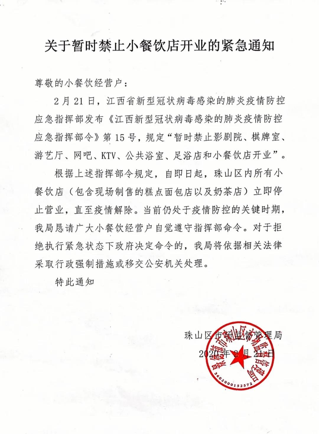 关于暂时禁止小餐饮店开业的紧急通知
