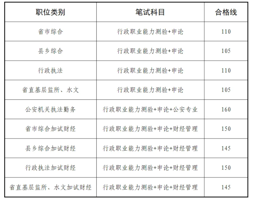 按职位类别分别划定合格分数线如下: