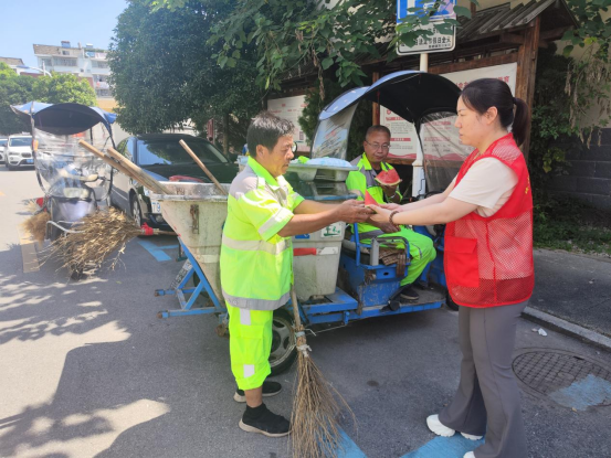 炎炎夏日,为有效预防和减少高温天气给户外劳动者带来的不利影响,助力户外劳动者度过一个舒适、凉爽的夏天,近日,石狮埠街道梨树园北苑社区开展为辖区环卫工人夏日送清凉活动。