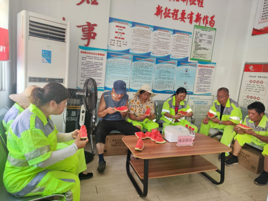 活动中,社区邀请环卫工人走进清凉驿站,送上了西瓜、矿泉水等防暑降温用品,大家在驿站内边吃西瓜边聊天其乐融融。社区工作人员还对户外劳动者不畏高温、坚守岗位的辛勤付出表示诚挚感谢,并提醒大家在做好工作的同时要保重身体、合理安排作息、劳逸结合。