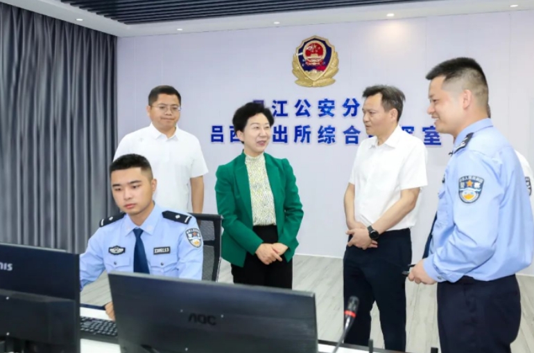 在昌江区公安分局吕西派出所,胡雪梅察看接警大厅、信访接待室和综合指挥室,看望慰问基层公安民辅警,向假期坚守岗位的值班人员表示亲切问候,并听取派出所基本情况介绍,询问公安民辅警队伍建设情况,结合电子显示屏展示和相关汇报,深入了解治安动态感知图、可用资源图、风险隐患图等治安“三张图”应用情况。“哪儿人流最密集?”“视频可以调阅吗?”“信息是否畅通?”……胡雪梅现场随机抽查,通过测警了解组织指挥能力、应急反应能力以及重点区域防控情况,强调要进一步加强统筹指挥、保障信息畅通,强化科技赋能、合理安排警力,更加高效防范风险、应急处置,确保社会治安稳定。