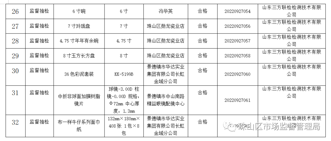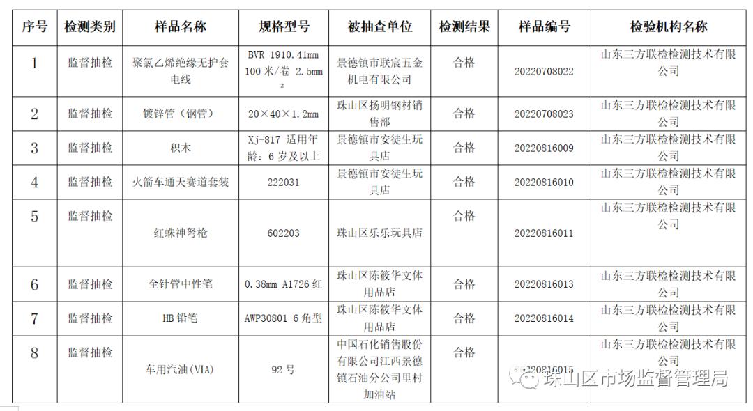 依据《中华人民共和国产品质量法》《江西省产品质量监督管理条例》《产品质量监督抽查管理办法》等有关规定,按照市局下发的工业产品质量监督抽查计划要求,今年以来珠山区市场监督管理局认真开展监督抽查工作,现将监督抽查检验结果公布如下: