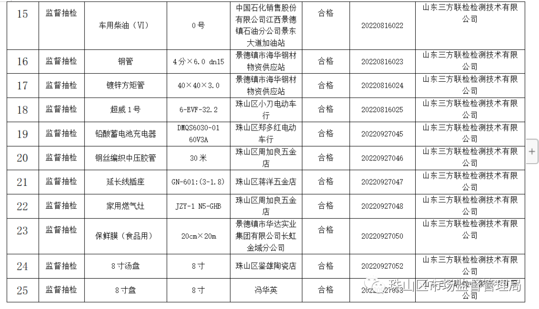 珠山区市场和质量监督管理局2022年工业产品质量监督抽查信息公示
