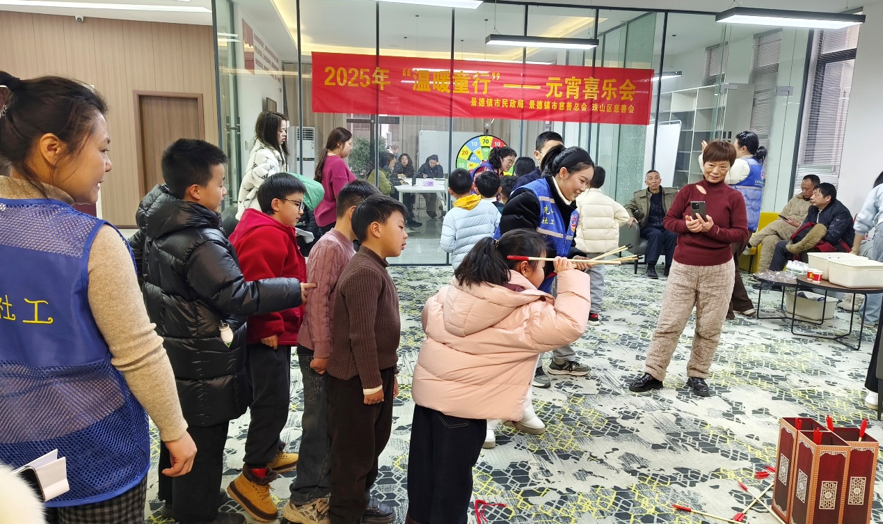 随后,在珠山区慈善会主办的“温暖童行——元宵喜乐会”上,猜灯谜、粘粘球大赛、投壶等趣味互动游戏吸引了众多儿童及家长,孩子们在社工和志愿者陪伴下玩得不亦乐乎。