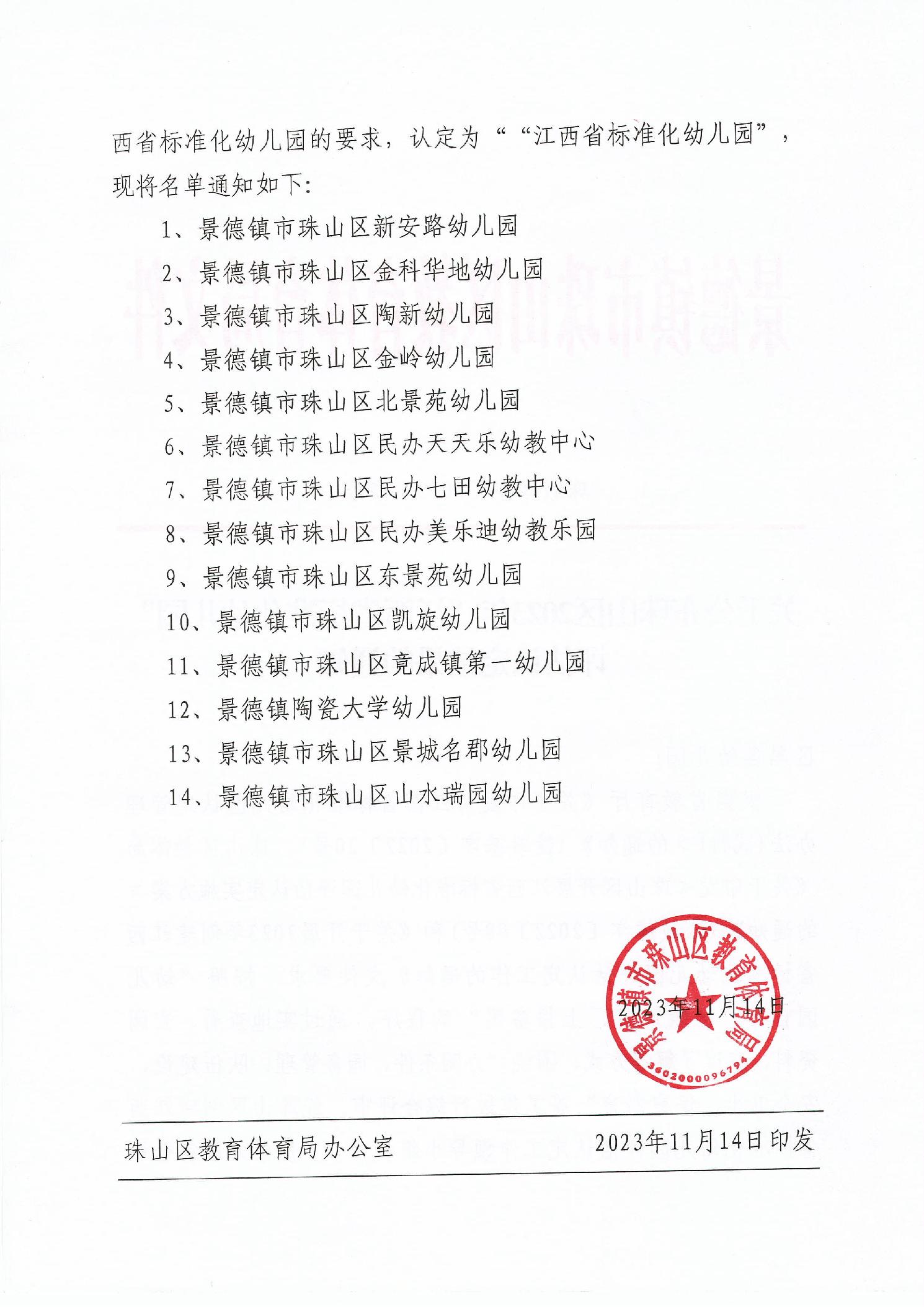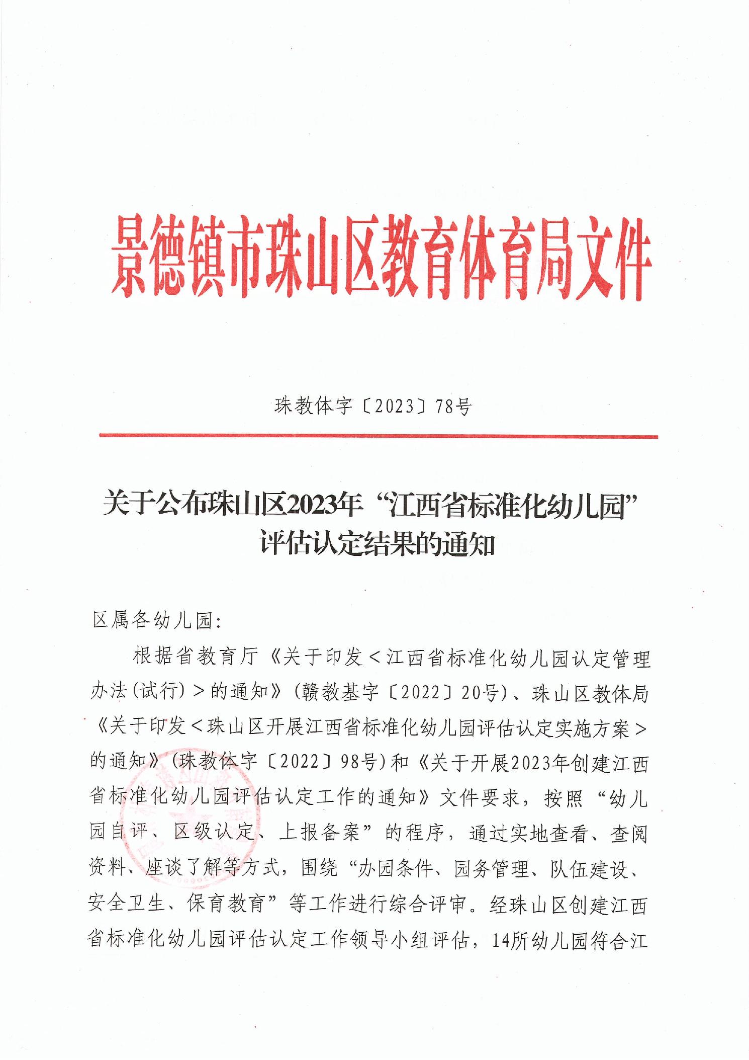 关于公布珠山区2023年”江西省标准化幼儿园“评估认定结果的通知